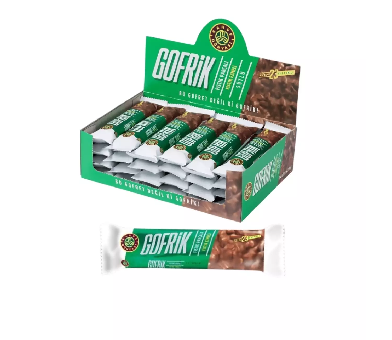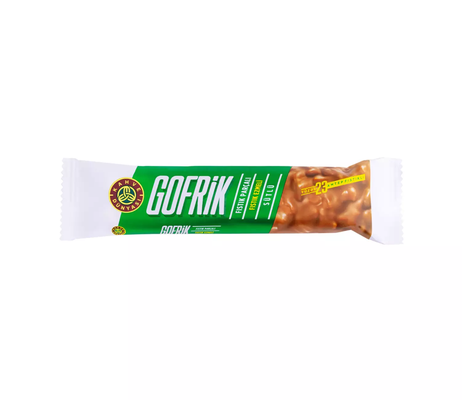 Kahve Dünyasindan yine bir ilk, gofret degil Gofrik! Bu kesinlikle bir gofret degil, %23 boz fistik ve fistik ezmesi oranyla benzersiz bir tat.