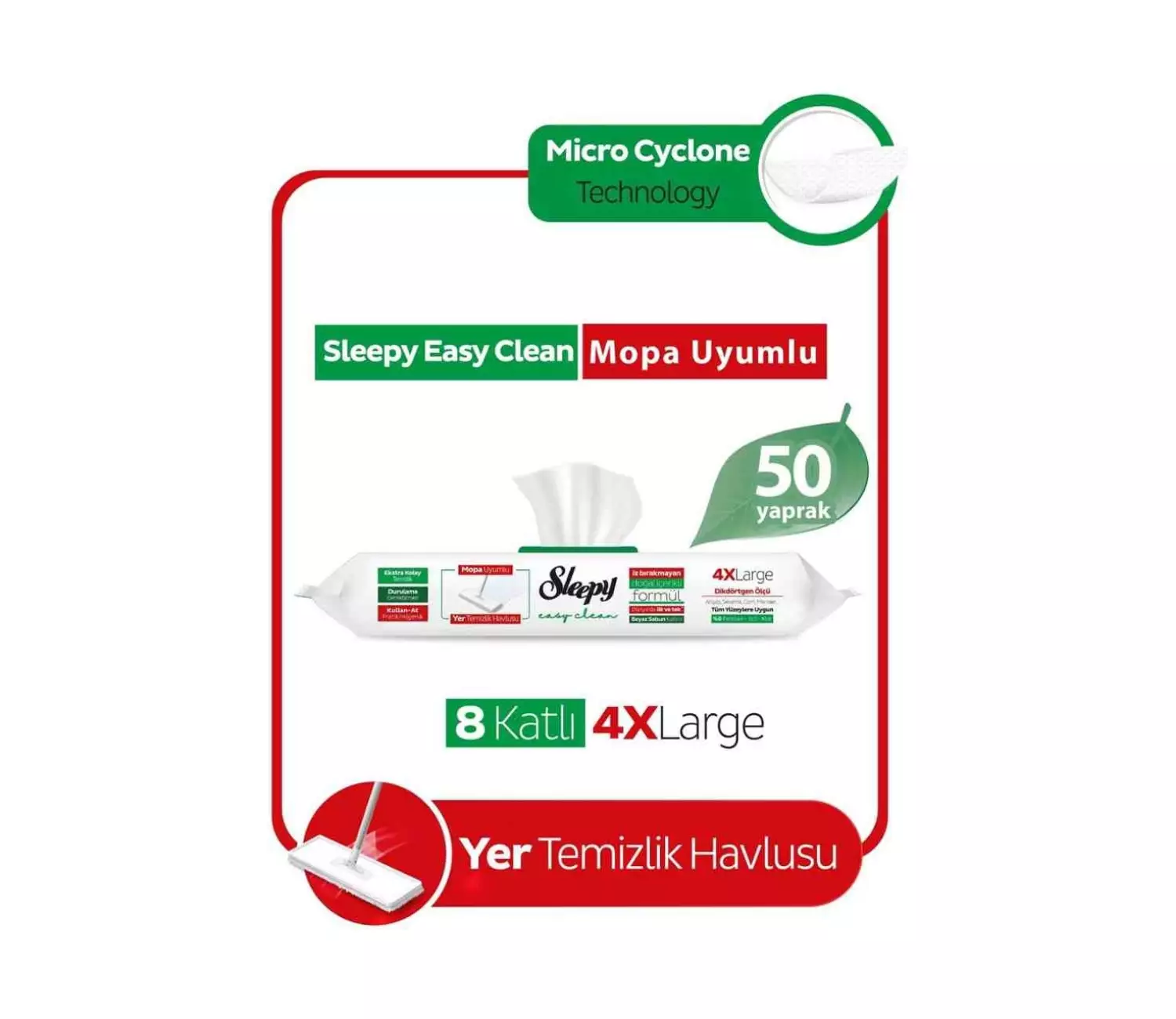 1; Sleepy Beyaz Sabun Katkılı 8 Katlı 4 X LargeMopa UyumluYer Temizlik Havlusu 50’li, Micro Cyclone teknolojiye sahip özelyapısısayesinde kirleri hapseder; 8 katlı kumaş yapısı ve 4 kat büyük yertemizlik havlusumopa uyumludur; Mükemmel beyaz sabun ile ferah bir kokubırakır; Beyaz sirke,karbonat, beyaz sabun içerir; Kullan; at temizlik ilepratiktir; Durulamagerektirmez; Paraben, SLS, Klor içermez; Ahşap, seramik,cam ve mermer gibisilinebilir tüm yüzeylerde kullanılır; Kullanım sonrasıpratik kapağı kapatarakıslaklığı muhafaza ediniz; Çocukların erişemeyeceğiyerde saklayın;