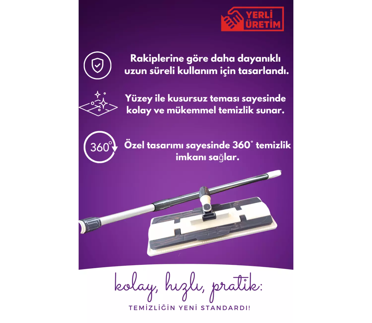 2; Mop aparatı uygun ölçülerdeki tüm tekkullanımlık yer temizlik havluları ve mikrofiber temizlik bezleri ile kullanıma uygundur; Güçlü kıskaçları sayesinde,kullanılan bezi/havluyu sıkıca tutmaözelliğine sahiptir;