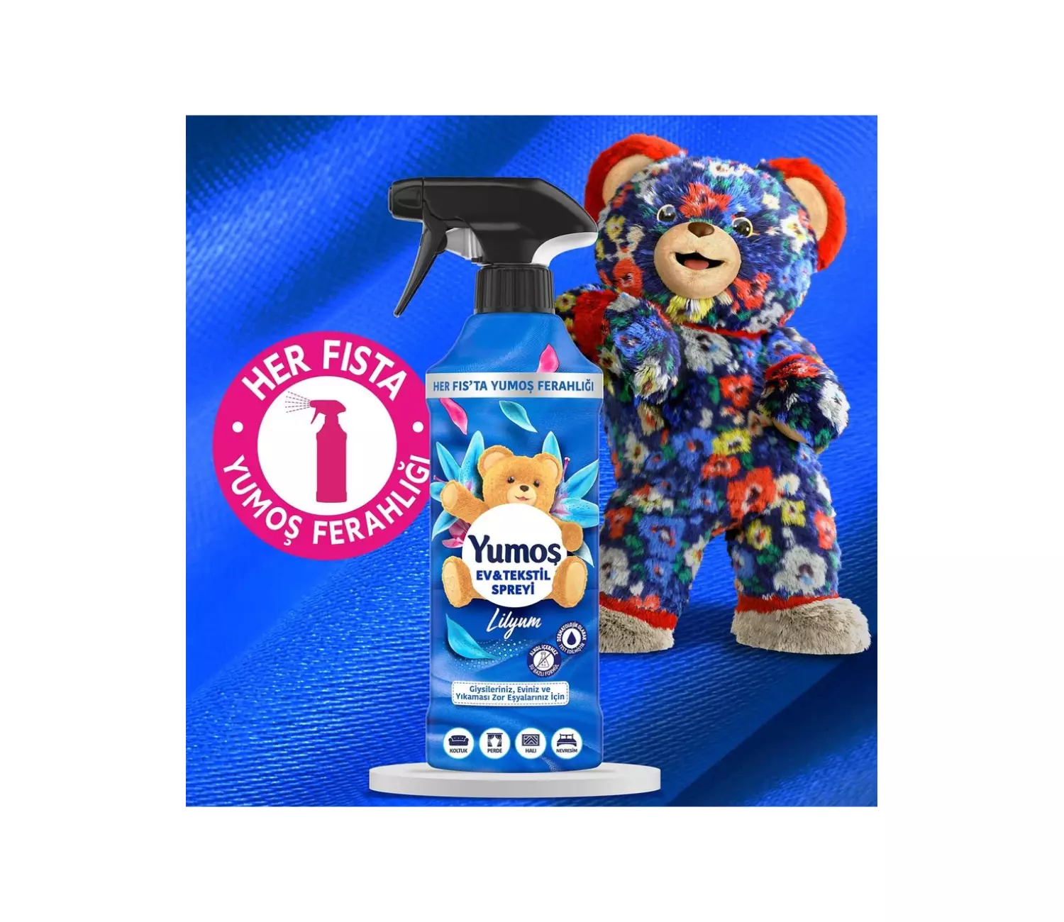 Şimdi Yumoş’un en sevilen yumuşatıcı kokuları yıkanması zor eşyalarında ve evinin farklı köşelerinde yanında. Hem de sadece tek fıs’ta! Yeni Yumoş Ev&Tekstil Spreyi yumoş ile her fıs’ta ferahlatıcı yumoş kokusunu evinin dilediğin köşesine taşıyabilir, yoğun tempolu günlerinde bile evindeki temizlik hissini koruyabilirsin. Hadi gel, Yumoş Ev&Tekstil Spreyi'nin farklı kullanım alanlarına göz atalım. Yumoş Ev&Tekstil Spreyi'ni koltuk, perde, halı gibi sürekli temizleyemeyeceğin, yıkanması zor ev eşyaların için kullanabilirsin. Yumoş Ev&Tekstil Spreyi'ni fısla, yumoş ferahlığını evinin her köşesinde doyasıya hisset! Üstelik Yumoş Ev&Tekstil Spreyi yumoş ile evini çiçek bahçesine dönüştürmek sandığından çok daha kolay. Sadece Yumoş Ev & Tekstil Spreyi'ni kullanmak istediğin yüzeye dik olacak şekilde 20 cm kadar uzaktan püskürt ve yumoşferahlatıcı kokusunun keyfini çıkar. Dermatolojik olarak test edilmiş Yumoş Ev&Tekstil Spreyi'nin alkol içermeyen ve su bazlı formülüyle sadece tek adımda yumoş ferahlığını evinin her köşesine taşıyabilirsin. Yumoş kokularını istediğin zaman, istediğin yoğunlukla kullanmak senin elinde.